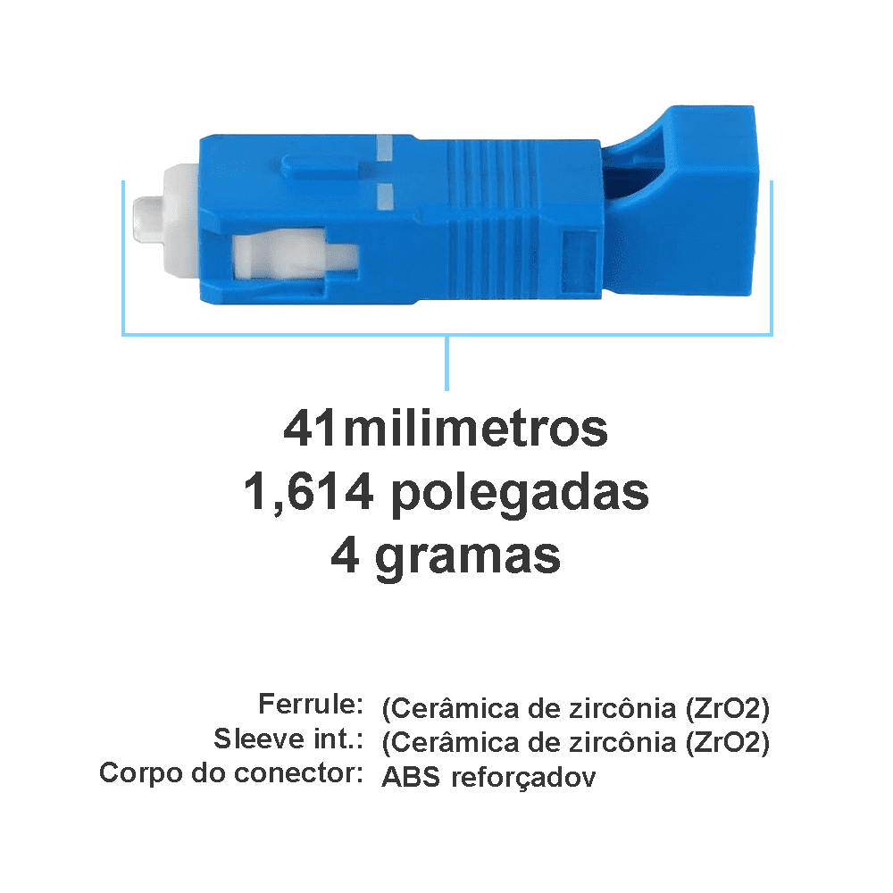 Material | Da manga de alinhamento (Sleeve): cerâmica de zircônio (ZrO₂), proporcionando alinhamento preciso e durabilidade superior; do corpo: plástico retardador de chama (geralmente PBT ou ABS), garantindo resistência térmica e mecânica |