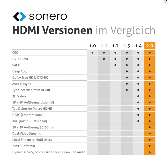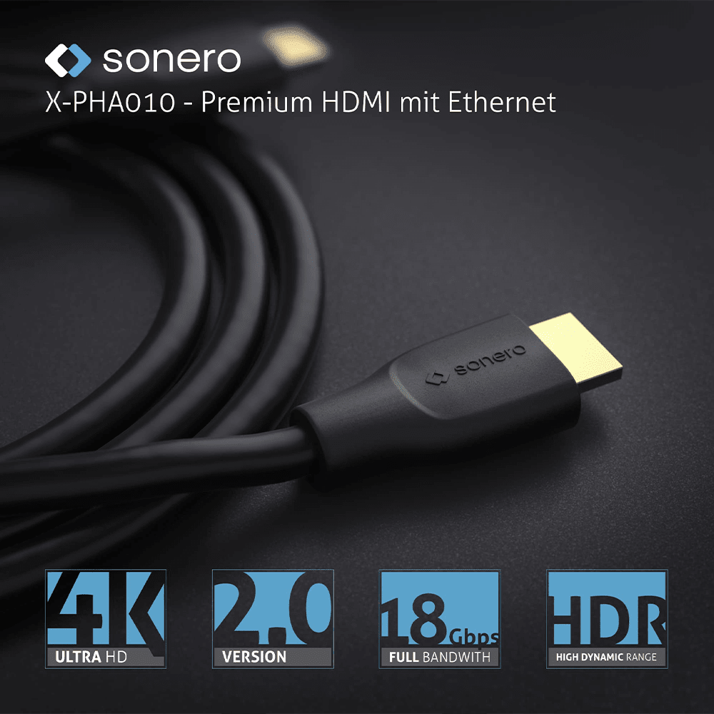Cabo HDMI 2.0 Sonero com certificação Premium HDMI.org, suporte a 4K@60Hz, HDR, ARC/eARC e 18 Gbps de largura de banda. Alta performance com blindagem, conectores dourados e qualidade alemã para sistemas AV exigentes.