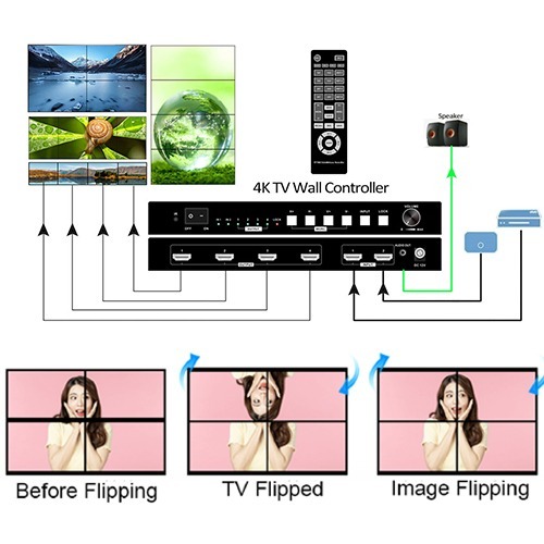 Este equipamento também suporta rotação de imagem em 180°, ideal para displays verticais, e ajuste de borda, para eliminar sobreposições ou lacunas entre as telas. O áudio pode ser extraído via saída P2 (3,5 mm) com controle de volume integrado. A operação pode ser feita tanto por botões no painel frontal quanto por controle remoto IR, oferecendo praticidade no gerenciamento do sistema.