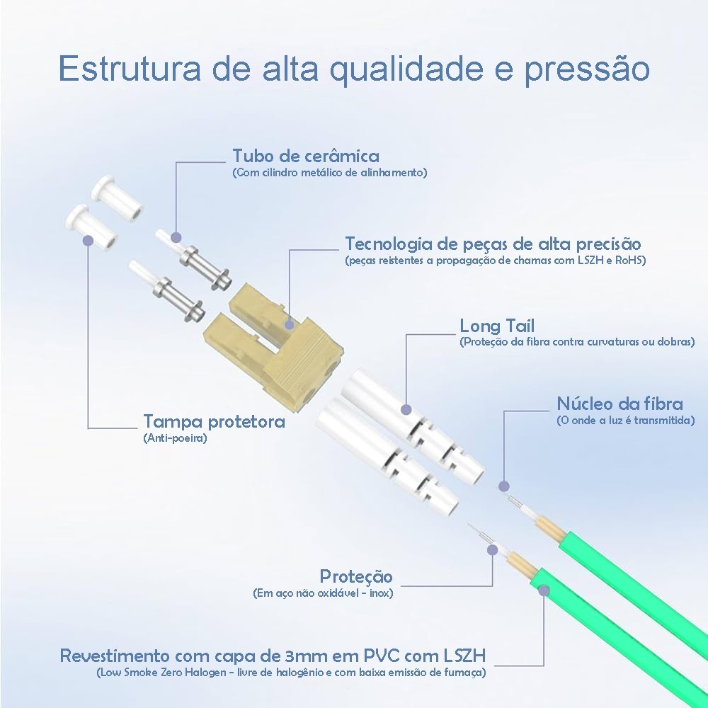 Seu revestimento LSZH de 3 mm, na cor Aqua, garante maior robustez em comparação com cabos convencionais de até 2 mm, oferecendo resistência extra contra atrito e tração. Além disso, possui certificação internacional RoHS, que assegura conformidade com padrões ambientais e de segurança, tornando-o uma solução confiável e sustentável para diferentes tipos de instalação.