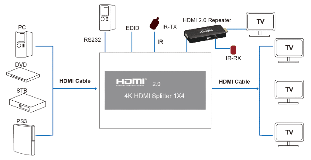 O Splitter HDMI 1×4 permite distribuir o sinal de uma única fonte HDMI para até quatro monitores ou projetores simultaneamente, com suporte a resoluções de até 3840×2160@60Hz. Ideal para aplicações que exigem alta qualidade de imagem em múltiplas telas, como sistemas AV residenciais, comerciais ou corporativos. Compatível com dispositivos como DVD players, receptores A/V, set-top boxes e câmeras digitais, também funciona como regenerador de sinal em instalações com cabos HDMI longos. O equipamento conta com gerenciamento EDID por DIP Switch com oito modos diferentes, permitindo total compatibilidade com diversos padrões de áudio e vídeo. Possui ainda função de extensão IR embutida, podendo ser utilizado com repetidores HDMI 2.0 com IR-RX para controle remoto da fonte. Construção metálica blindada, operação Plug & Play e LEDs indicadores completam o conjunto.