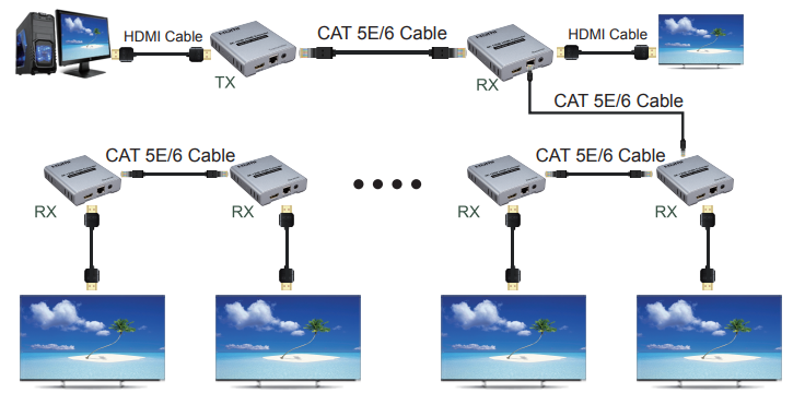 Cada unidade (Tx e Rx) possui duas entradas de vídeo selecionáveis (HDMI e RJ45), além de duas saídas (HDMI e RJ45), oferecendo recursos como loop-out para monitoramento local e cascateamento de sinal para ampliar sua estrutura de distribuição. A tecnologia IR bidirecional permite controle remoto dos dispositivos na fonte, utilizando o mesmo cabo UTP.