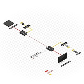 Extensor HDMI com IR bidirecional até 80m via cabo Cat.6. Suporte a vídeo Full HD, áudio multicanal e controle remoto em ambas as pontas com alimentação simplificada por PoC.