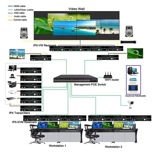 A interface frontal possui tela LCD com informações de IP, ID e status, facilitando a configuração no campo. A solução é livre de servidor, ou seja, eventuais falhas em dispositivos não comprometem o funcionamento do sistema. Amplamente utilizado em centros de comando, ambientes inteligentes, salas de controle, parques tecnológicos e empresas, entrega estabilidade, controle remoto e distribuição eficiente de vídeo e áudio. Observações: Não requer caixas de controle IP. Suporta personalização da interface do usuário.