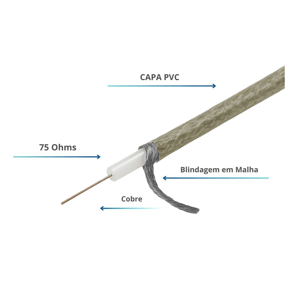 Sua construção conta com dupla blindagem BF+T (manta de alumínio + malha) e envoltório em alumínio, reduzindo interferências eletromagnéticas e eletrostáticas e mantendo maior integridade na transmissão do sinal.