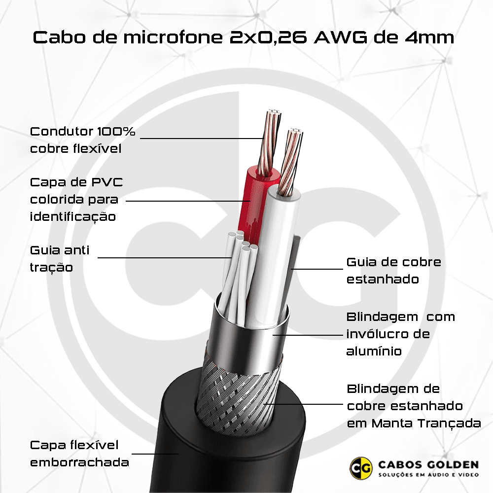 Fio de Microfone 2x0,20mm OFHC com Dupla Blindagem 4MM Qualidade Profissional com Máxima Proteção EMI/RFI