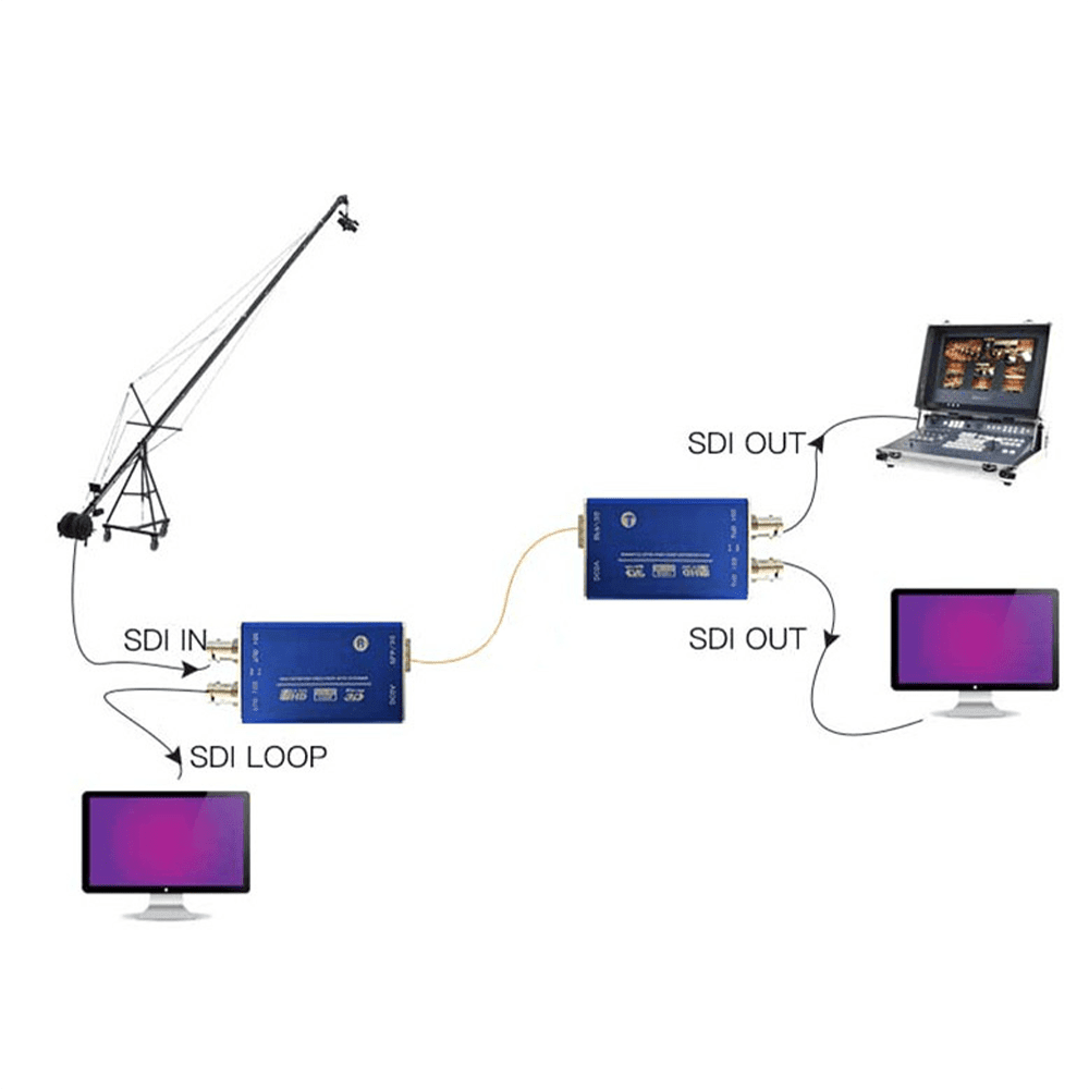 Conversor profissional de Fibra Óptica para SDI 3G com transmissor e receptor para transporte de sinais 3G/HD/SD-SDI e ASI por longas distâncias. Suporta até 1080P@60Hz, loop SDI no transmissor e saída dupla no receptor. Construção industrial, operação estável em ambientes exigentes e alimentação por bateria V-mount ou power bank. Alcance de até 100 km via fibra óptica, LEDs de status e baixo consumo energético.