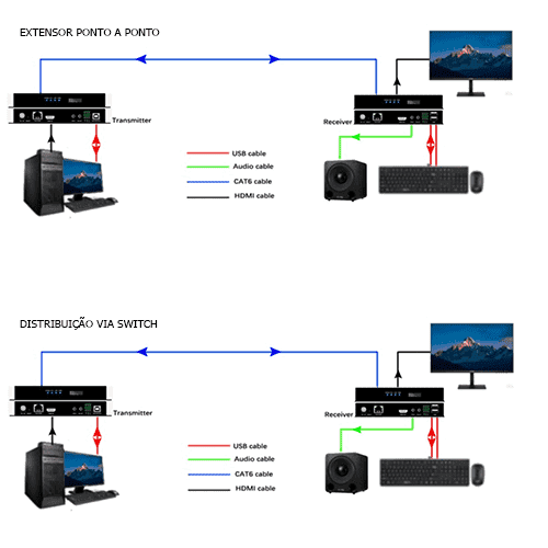 Pode ser utilizado em sistemas 1 para N, N para 1 ou N para N usando switch Gigabit. Não há limitação na quantidade de transmissores e receptores conectados.