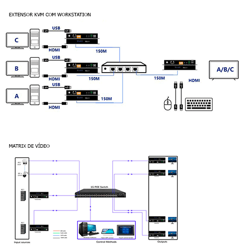 Sistema AV sobre IP Full HD com funções avançadas como matriz, videowall, multiviewer e KVM, transmissão HDMI/USB via cabo de rede com suporte a POE e controle por software.