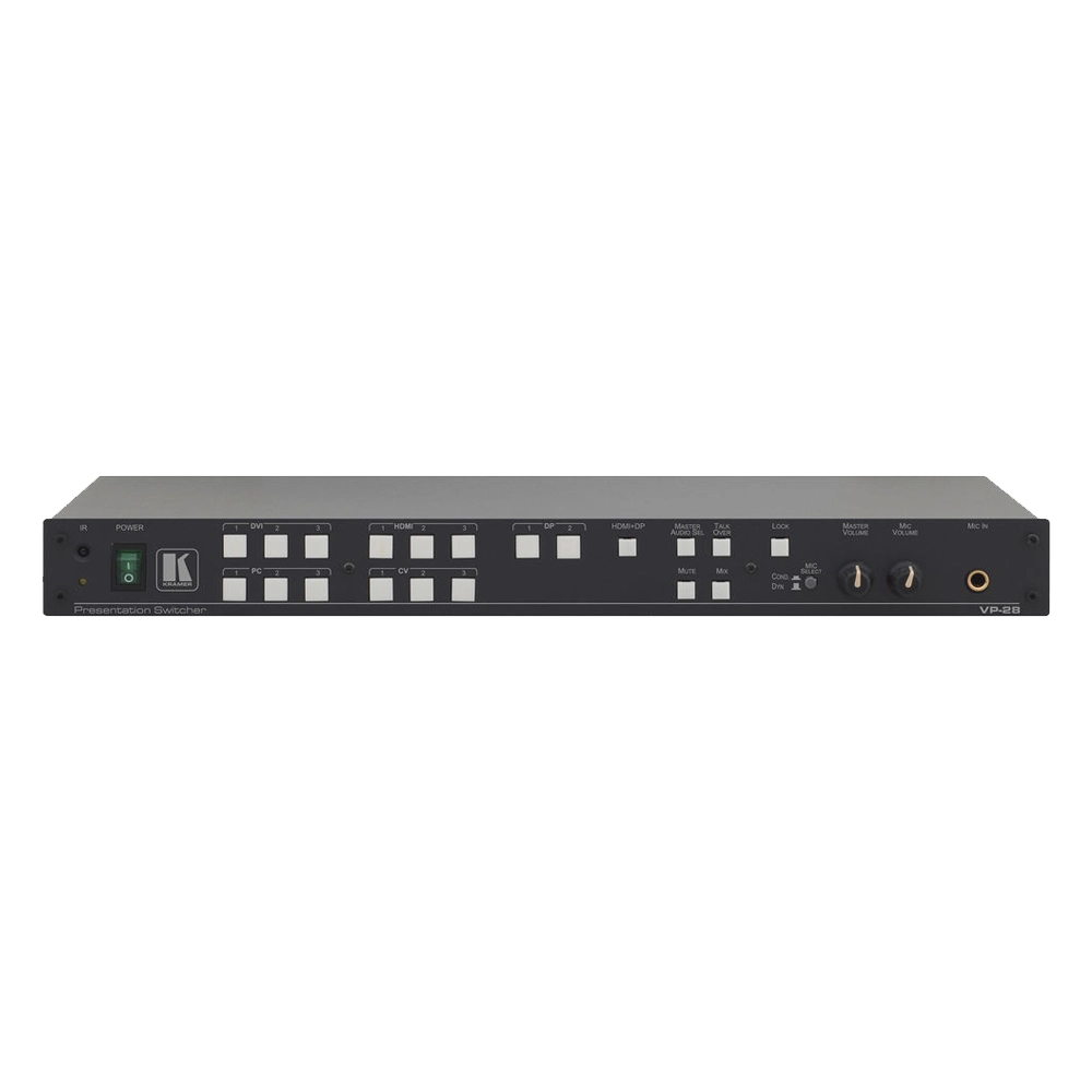 O Kramer VP-28 é um comutador de apresentação multiformato de alto desempenho, projetado para gerenciar sinais de vídeo composto, HDMI, DVI, DisplayPort, vídeo de computador e áudio estéreo e microfone.
